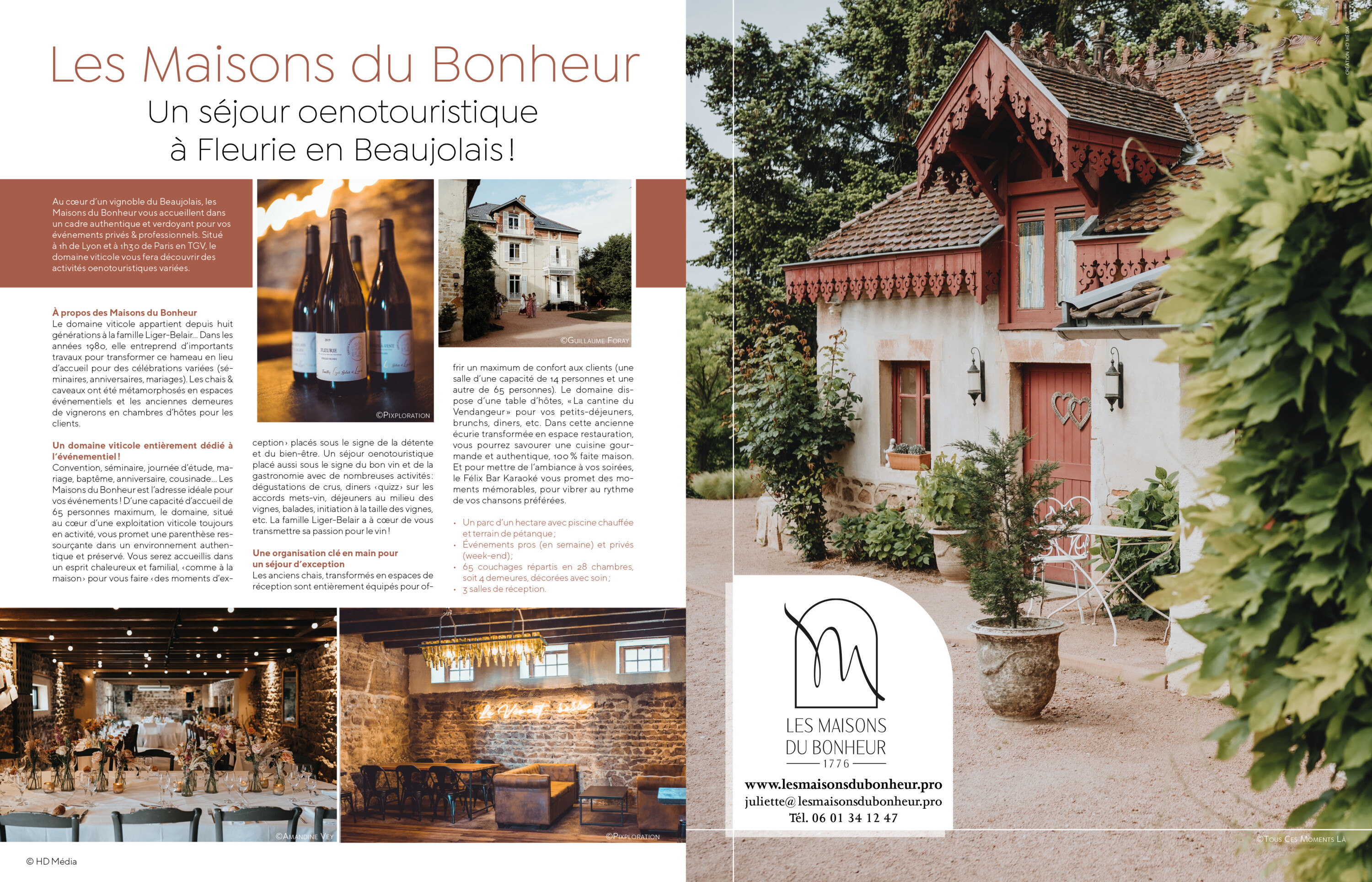 Derrière le nom plein de promesses “Les Maisons du Bonheur”, il y a un domaine familial transformé en lieu de réception au cœur du Beaujolais. Du chai à la cave, en passant par les maisons de vignerons et l’écurie… l’ensemble des bâtisses a été rénové avec goût, en veillant à respecter l’authenticité de ce vaste domaine chargé de souvenirs.